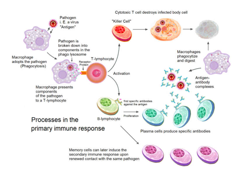 The innate immune response is immediate and occurs over the course of 96 hours depending on where the pathogen enters the body. Important cells that serve a purpose in this immune response are natural killer cells (a white blood cell that has small particles with enzymes that can kill infected cells), macrophages (large cells that engulf and destroy target cells, bacteria, and other large pathogens), and neutrophils (white blood cell that heals tissues and infections) (monocytes and granulocytes above). Other important immune cells are the dendritic cells (Langerhans on the diagram is a type of dendritic cell, antigen-presenting cell), mast cells (responsible for immediate allergic reactions), basophils (white blood cell, also allergy-associated), and eosinophils (white blood cell, commonly seen with allergies, parasitic infections, and cancer)(granulocytes above). The innate immune response senses pathogens and their products but doesn’t require antigen presentation (see below). All these cells can initiate inflammatory reactions at the site of infection or damage.